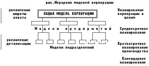 Введем понятие иерархии моделей, гдте широта охвата увеличивается, а детализация уменьшается по мере того, как мы переходим на более высокие уровни иерархии. На более высоких уровнях в свою очередь формируются ограничения и цели для более низких уровней.