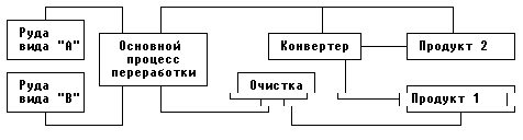 Тот факт, что в модели ЛП балансовые уравнения должны быть линейными, исключает возможность представления таких принципиально нелинейных зависимостей, как сложные химические реакц изменения условий функционирования, которые допускают линейное описание (хотя бы приближенно) могут быть учтены в модели. Балансовые соотношения могут быть введены для какой-то законченной части блок-схемы, например для отдельного блока; обычно они выписываются для каждого технологичедского потока, который в блок-схеме изображается линией. Количество вещества, полученного, может быть, более чем из одного блока, входящего в поток, равно количеству этого вещества, выходящего из потока (и поступающего как сырье, возможно, более, чем в один блок).