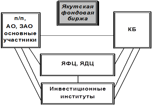 В республике зарегистрировано, 35 организаций имеющих лицензии инвестиционных институтов выданных Министерством финансов Республики Саха (Якутия), из них первый -инвестиционный фонд “Саха-Инвест”, являющийся крупнейшим инвестиционным фондом Сибири и Дальнего Востока. Имеется 7 страховых компаний, 3 независимых пенсионных фонда, 1 депозитарий “Якутский депозитарный центр”(имеющий лицензию Федеральной комиссии по ценным бумагам) и являющийся уполномоченным депозитарием по учету и хранению Облигаций государственного займа Республики (ОГЗ), 2 специализированных регистратора - Республиканский специализированный депозитарий “Якутский фондовый центр” ведущий реестры 22 эмитентов и регистратор - акционерная компания “Алмазы России-Саха” ведущий только реестр компании ,202 специалиста имеющих аттестаты Министерства финансов 1 категории .Существует , но не работает Якутская фондовая биржа .Наиболее активным участником рынка ценных бумаг является инвестиционная компания “Саха Инвест-Сервис”, являющейся членом Ассоциации участников фондового рынка республики ,занимающейся управлением активами инвестиционного фонда “Саха-Инвест”, маркет-мейкером рынка вексельного обращения ,дилером Министерства финансов по работе с облигациями государственного займа ,активно работающий с взаимозачетами.[15].