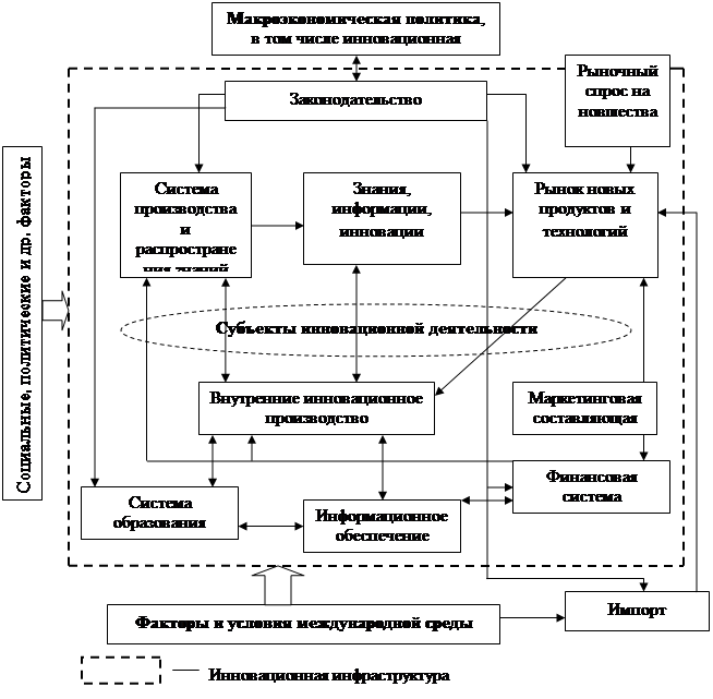 Кроме указанных элементов, необходимо рассматривать совокупность социальных, политических, культурных и международных факторов, которые оказывают непосредственное влияние на динамику и характер развития инновационной системы в пределах национальных границ.