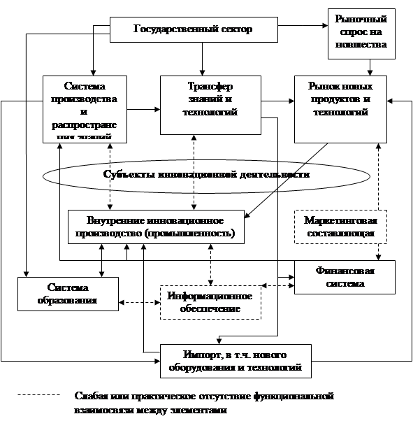 Оценка результативности институциональных и организационных механизмов регулирования инновационной системы России показала, что они требуют существенной корректировки. В частности, на государственном уровне отсутствует структура, которая представляла бы интересы научно-инновационного комплекса в целом и могла бы принять на себя координирующие функции в этой сфере. Формированию эффективной и систематической инновационной политики препятствует, прежде всего, разрушение значительной части промышленного потенциала страны, в том числе ориентированного на выпуск наукоемкой продукции, отрыв инновационной сферы от производственного сектора, отсутствие адекватной производственной базы, доступа к иностранному капиталу (в т.ч. технологическому), механизмов использования государством принадлежащей ему интеллектуальной собственности, низкой законодательной активность властей (в т.ч. на региональном уровне).