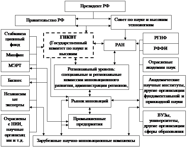 Роль государства в регулировании российской инновационной системы определяется решением следующих проблем: создание конкурентной среды для долговременного развития хозяйствующих субъектов; организация процесса производства знаний; корректировка с использованием передового зарубежного опыта институциональных инструментов, обеспечивающих инновационное взаимодействие между наукой, бизнесом и государством; поддержание баланса между конкуренцией и кооперацией предприятий, а также государственных структур при создании и продвижении инноваций; содействие трансферу технологий и информации от научной среды к бизнесу; развитие процессов имитации и адаптации иностранных технологий; оптимизация механизма финансирования инновационного процесса (разработка новых форм кредитования крупных инновационных проектов, предоставление государственных гарантий по привлеченным в инновационную сферу кредитам, консолидация государственных и частнопредпринимательских финансов); содействие формированию международных и региональных технологических стратегических альянсов и т.д.