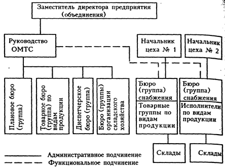 Организационное построение, характер и методы работы служб снабжения на предприятиях отличаются своеобразием. На небольших предприятиях, потребляющих малые объемы материальных ресурсов в ограниченной номенклатуре, функции снабжения возлагаются на небольшие группы или отдельных работников хозяйственного отдела предприятия. На большинстве средних и крупных предприятий эту функцию выполняют специальные отделы материально-технического снабжения (ОМТС), находящиеся в подчинении у заместителя руководителя предприятия по производству. Поскольку качество работы отдела во многом определяет качество производственного процесса, то он должен быть укомплектован высококвалифицированными специалистами. Кроме того, многие решаемые отделом вопросы носят комплексный характер, требуют знаний в области маркетинга, логистики, техники, технологии, экономики, нормирования, прогнозирования, организации производства и межпроизводственных связей.