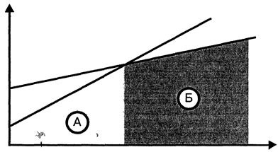 А - зона эффективности длинного канала сбыта товара с оптимальным числом посредников, Б - зона эффективности короткого канала сбыта с наименьшим числом посредников.
