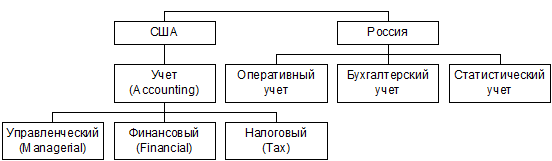 Существует еще одно важное замечание, касающееся различия в определениях. Обычно при соотнесении российской и американской учетной практики рассматривают, соответственно, бухгалтерский учет в России и финансовый учет(financial accounting) в США. Однако, учет (accounting) в США не ограничивается только финансовым учетом. В одном из американских учебников по учету выделяются четыре подвида учета: