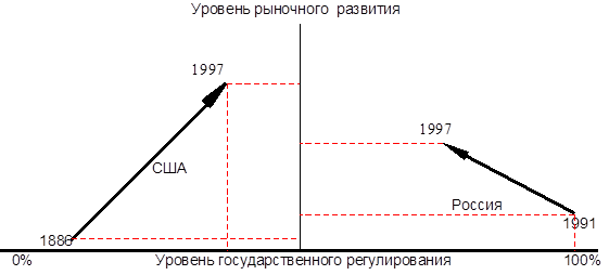 Видно, что Россия начала свое движение с точки более высокого развития (т.к. смогла использовать большое количество международных наработок) и много большего уровня регулирования, чем США. А если мы учтем, что в США процесс развития шел во много раз дольше, то прогресс России следует признать исключительно быстрым.