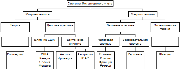 Другая интересная модель, в которой типизация осуществляется не только путем выделения характерных типов и черт, но и их иерархическим подчинением друг другу, приведена на Схеме 2.Верхний уровень иерархии определяет то, на какие экономические цели ориентируется учетная система страны - макро- или микроэкономические. Потом осуществляется градация в зависимости от того, на что ориентируется страна в построении системы учета - на теоретические разработки, или на практические потребности либо делового мира, либо законодательства. Наконец, в системах,. ориентированных на практику, можно осуществить деление по тому, как осуществляется регулирование - при помощи законодательства (британская система и Германия), или основную роль играют подзаконные акты. В макроэкономической ветви это прежде всего особенности налогообложения, а в американской - постановления частных организаций.