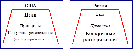 Основой, на которой базируются принципы, являются цели учета. Можно сказать, что цели учета в России и США достаточно сильно различаются. Если выделять главное требование, предъявляемое к отчетности, то можно сказать, что если в США главное требование — разумность и полезность информации для принятия пользователем коммерческих решений, то в России главное требование — соблюдение различных правил ведения учета, предоставление формально правильной информации контрольного характера. И это различие целей нельзя упускать из виду, так как применение одинаково называющегося и определяющегосяпринципа может быть совершенно различным в приложении к различным целям.