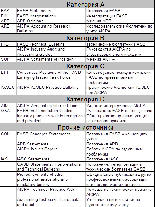 Вышеуказанные источники GAAP разбиты по категориям в зависимости от значимости. Если между ними существует противоречие, то использовать следует принципы более высокой категории. Если друг другу противоречат принципы, принадлежащие к одной категории, то следовать следует тому из них, который лучше отражает экономическую суть операции.