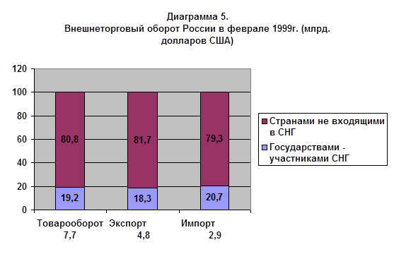 В феврале 1999 внешнеторговый оборот России ( на основе данных таможенной статистики и с учетом официально не регистрируемого экспотра(импорта)) составил в текущих ценах 7,7 млрд. долларов США (177,0 млрд. р.) и по сравнению с февралем 1998г. снизился на 34,4%, в том числе экспорт составил 4,8 млрд. долларов США (110,4 млрд. р.) и снизился на 18,1%; импорт – 2,9 млрд. долларов США (66,6 млрд. р.) и снизился на 50,4%.
