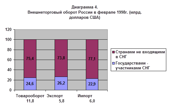 По данным таможенной статистики в январе - ноябре 1998 г. внешнеторговый оборот России (без учета неорганизованной торговли) составил 104 млрд. долларов США и по сравнению с январем - ноябрем 1997 года снизился на 15,6%, в том числе со странами дальнего зарубежья - 1,1 млрд. (на 15,2%), со странами СНГ - 22,9 млрд. (на 17,2%).