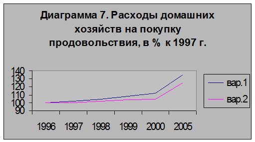 Расходы на приобретение продуктов питания по оптимистическому варианту вырастут по сравнению с 1995 годом на 35,5%, а по боле скромному второму – на 26,4%.