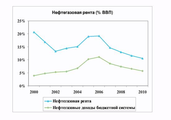 Несмотря на это, взрывное расширение притока иностранного капитала вызовет дальнейшее реальное укрепление рубля, сокращающее удельный вес экспортноориентированных отраслей в ВВП. В итоге размеры нефтегазового комплекса, включая добычу, переработку и транспортировку, стабилизируются на уровне 210—220 млрд. дол., а его доля в ВВП будет быстро падать: с 23% в 2006 г. До 13% в 2010 г. Соответственно, расчетная величина природной ренты в нефтегазовом секторе сократится почти вдвое — с 19,1% ВВП в 2006 г. до 10,6% ВВП в 2010 г., как и изъятие нефтегазовой ренты в бюджетную систему (см. График).[16]