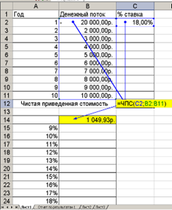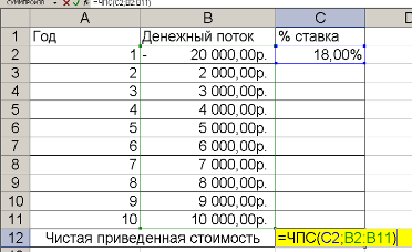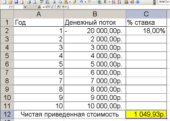 2. При решении задачи необходимо применить финансовую функцию ЧПС: =ЧПС(C2;B2:B11).