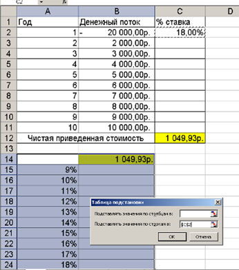 Ответ: чистая приведенная стоимость проекта равна 1049,93 руб.; первоначальный взнос должен составлять 20058,92 руб. чтобы ЧПС=1000 руб.