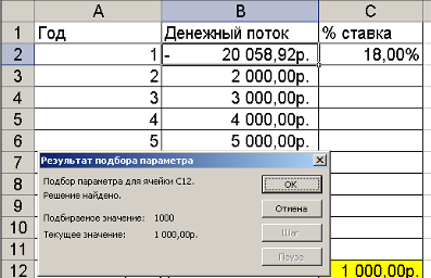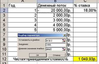9. Результат подбора параметра положительный: первоначальный взнос должен составлять 20058,92 руб. чтобы ЧПС=1000 руб. (рис.1.9):