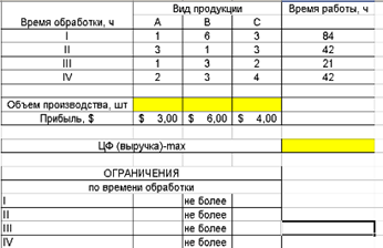 Фирма производит три вида продукции А, В, С, для выпуска каждого требуется определенное время обработки на всех четырех устройствах I, II, III, IV: