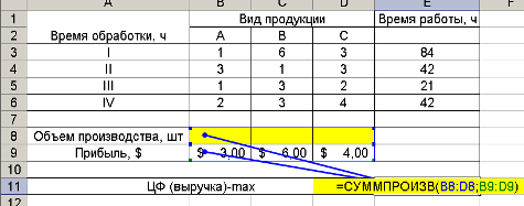 4. Для нахождения ЦФ используем функцию Excel СУММПРОИЗВ из категории математических: =СУММПРОИЗВ(B8:D8;B9:D9) (рис. 2.3). Значение введенной ЦФ равно нулю, т.к. значения объема производства тоже пока нулевые.