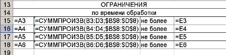 5. Заполним формулами таблицу ограничений согласно математической модели – (рис.2.4 и рис. 2.5):