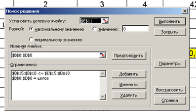 Оптимизация рассматриваемой модели, т.е. поиск неизвестных, при которых достигается максимум целевой функции и удовлетворяются все введенные условия, выполняется встроенной процедурой автоматического поиска решения.