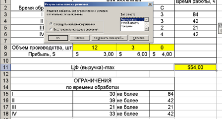 Рис 2.8.. Фрагмент рабочего листа с окном результата поиска решения