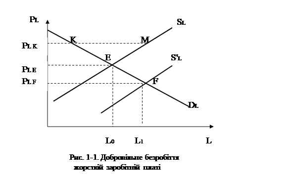 Разом з тим в неокласичній моделі безробіття може мати місце і при зберіганні гнучкості заробітної плати, оскільки деяка частина робочої сили буде залишатися без роботи за власним бажанням, претендуючи на більш високі заробітки. Цю ситуацію ілюструє рис. 1-2.