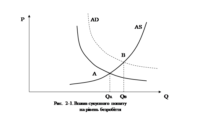 Безробіття на природному рівні необхідне, тому що стримує інфляцію. В економіці з повною зайнятістю будь-який сплеск сукупного попита AD обертається зростанням рівня цін, оскільки виробництво не може адекватно відреагувати на попит, який виріс, через нехватку ресурсів (рис. 2-2).