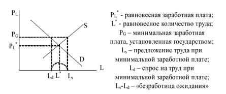 Не следует, однако, обольщаться относительно эффективности государственного регулирования трудовых отношений. Так, в странах с развитой рыночной экономикой устанавливаемая государством минимальная заработная плата зачастую оказывается выше равновесной цены труда. В результате возникает «безработица ожидания», поскольку предложение труда возрастает, а спрос на него падает (рис. 1).