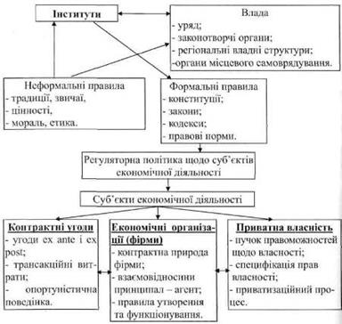 Відповідь на ці і подібні питання полягає у тому, що влада є відправною по відношенню до інституту, а інститут є наслідком влади. За таких обставин інститут, який базується на формальних нормах відносин між соціально-економічними агентами забезпечує виконання встановлених правил шляхом санкцій і обмежень та визначає права власності і відповідальність у схемі «влада – підлеглі». За подібного умовиводу інститути з одного боку уявляються як породження влади, а з іншого – його підґрунтям. Таким чином, інститути і влада є взаємозалежними та взаємообумовлюють існування один іншого, тобто інститути віддзеркалюють владу, а влада – інституційну структуру. Тому результатом формування інституційного середовища виступає не тільки величина трансакційних витрат, але й порівняльна норма віддачі ресурсу у вигляді величини доходу. Що стосується реалій економіки України, то величина доходу безпосередньо була пов'язана з економічною рентою, яку могли отримати можновладці, експлуатуючи недосконалість інституційного середовища.