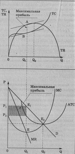 График второго метода показывает, что максимум прибыли можно определить, сопоставляя предельный доход (MR) и предельные издержки (МС). Максимальная величина будет наблюдаться при равенстве данных показателей. Положение равновесия фирмы определяется точкой Е (пересечение MR и МС). Если из этой точки провести вертикаль до кривой спроса D, то будет ясна та цена, которая обеспечивает наиболее высокую прибыль. Эта цена устанавливается на уровне Е2 Выделенный рядом прямоугольник означает величину монопольной прибыли.