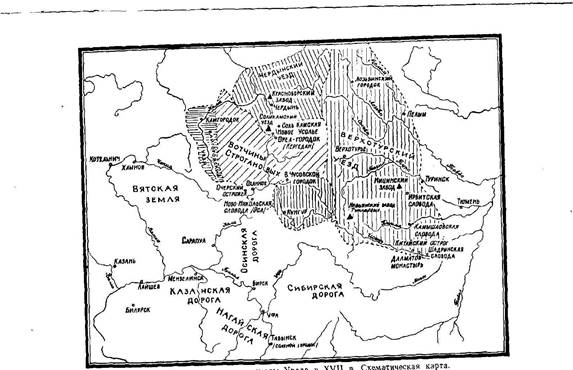Кроме Строгановых, в ХVII в. на Урале были и другие помещики я вотчинники. В Осияском уезде, на Тулве, находилась вотчина А. Крылова; в устье Усолки до середины ХVII в. — небольшая вотчина боярина В. И. Стрешнева; много небольших дворянских поместий группировалось вокруг Уфы.