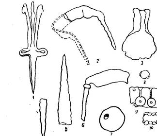 2. Орудия труда, предметы быта и остатки оружия из раскопок Орла-городка: 1 – железный светец для украшения лучины, 2 – скобель, 3 – сечка для рубли капусты, 4 – железный резей для работы по кости, 5 – железное копье, 6 – серп, 7 – глиняное грузило, 8 – свинцовая пуля для пищали, 9 – форма для отливки свинцовых пуль, 10 – кремневое кресало для пищали