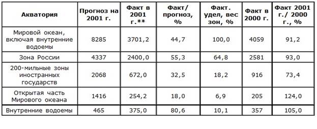 В открытой части СВА по сравнению с 2000 г. выловлено почти на 20 тыс. т меньше в связи с резким снижением добычи морского петуха (триглы). Надежды на стабилизацию сырьевой базы последнего не оправдались. По-видимому, причиной тому была весьма скромная численность популяции, а также распределение рыбы на акватории иностранных государств.
