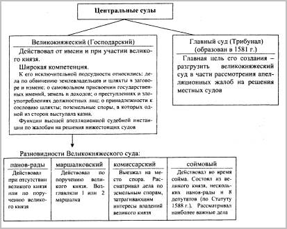 а также суды для отдельных групп населения – духовенства, мещан, крестьян, татар, евреев. Высшим судебным органом в государстве был великокняжеский (гаспадарский) суд, также суд панов-рады, сейма и их разновидность – комиссарский суд. Но позже судебная власть великого князя и панов-рады была ограничена. В 1581г. был принят сеймом закон о создании Главного суда (Трибунала), на который возлагались аппеляционный пересмотр дел и рассмотрение некоторых дел в первой инстанции. Остальные дела должны были рассматриваться в местных судах. Главный суд (Трибунал) состоял из выбранных на поветовых Сеймиках шляхты судей по 2 от повета, заседал ежегодно посессионно (до 22 недель в год) в Минске, Вильне и Новогрудке попеременно.