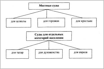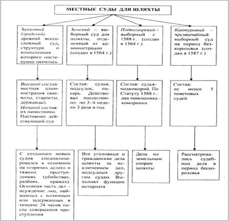 К местным судам относились замковый (гродский), земский, подкоморский, магистратский и копный. Порядок формирования, структура, компетенция и правовой статус их были неодинаковы. Система местных судов представлена на схеме 2.2.