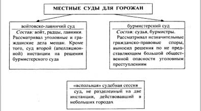 На новых принципах выборности и участия представителей горожан создавались войтовско-лавничие и бурмистерские суды, которые действовали в городах, имеющих Магдебургское право (рисунок 2.4). Им были подсудны гражданские и уголовные дела горожан. Войтовско-лапничий суд состоял из войта как председателя суда, его заместителя (лент-войта) и лавников (заседателей), избираемых мещанами. Незначительные правонарушения и споры мещан рассматривались на суде городских бурмистров. Таким образом, создание независимых от местной администрации выборных судов свидетельствовало о новом этапе в развитии правовой культуры общества, стремлении к постепенному установлению правового порядка в государстве. Этот радикальный поворот в правовой теории и взглядах на роль суда в обществе в XVI в. нашел закрепление в Статуте ВКЛ 1588 г. и начал осуществляться в Западной Европе только в XVII-XVIII вв. [6, c. 59]