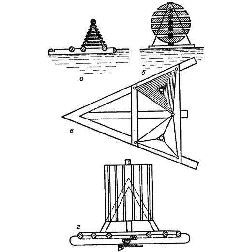 Бакены представляют собой трехгранные деревянные пирамиды (рис. 19), укрепленные на плавающих плотиках. Тросом с грузом или небольшим якорем бакен неподвижно удерживается на своем штатном месте в русле реки.