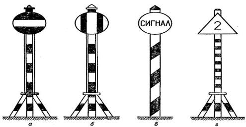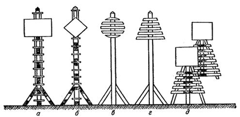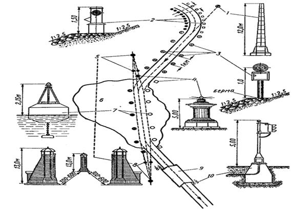 Судоходная обстановка на искусственных водных путях (каналах и водохранилищах) технически более совершенна, чем на реке, а поэтому может по своей конструкции, внешнему виду и освещению отличаться от знаков речной обстановки (рис. 25).