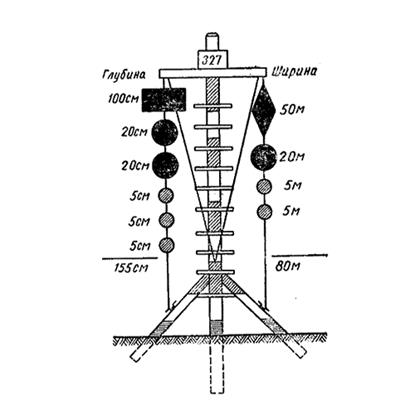 Ширина судового хода определяется числовым значением знаков, которые поднимаются на нижней (по течению) оконечности реи мачты и обозначают: ромбовидный знак — 50 м ; большой красный шар — 20 м ; малый шар — 5 м каждый. Например, если на верхней оконечности реи подняты один прямоугольный щит, два красных больших шара и три малых шара, это значит, что глубина на перекате 155 см (рис. 21).