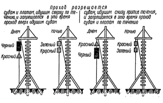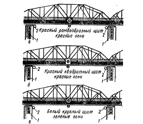 Кроме этих огней, на опорах мостов, ограничивающих судоходные пролеты и пролет для сплава, в ночное время включаются вертикально расположенные зеленые огни: четыре огня, если высота нижней кромки фермы над водой составляет более 15 м , и три огня при высоте моста над водой от 10 до 15 м и по два огня, если эта высота менее 10 м . Зеленые огни устанавливаются на специальных зеленых или белых квадратных щитах, которые одновременно служат указателем габаритов судового хода под мостом в дневное время. В случае необходимости на 1 км выше охраняемого моста на 200 м ниже выставляют мостовые сигнальные мачты, окрашенные в красный цвет. На реи мачты поднимают такие же сигналы, - как на семафорной мачте для разрешения или запрещения прохода судам под мостом.