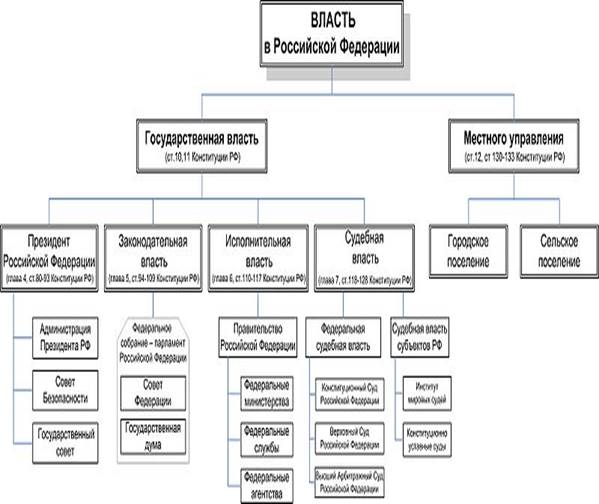 В отечественных конституциях всегда закреплялись система органов государства, основы управления государственными организациями, государственные планы и бюджеты. В действующей Конституции Российской Федерации установлены основы организации государства, принципы осуществления государственной власти, компетенция федеральных государственных органов, порядок введения налогов, управления государственной собственностью, утверждения и исполнения бюджета, федеральных программ. В конституциях и уставах субъектов Российской Федерации регулируются вопросы организации власти, их финансов, бюджета и налогов.